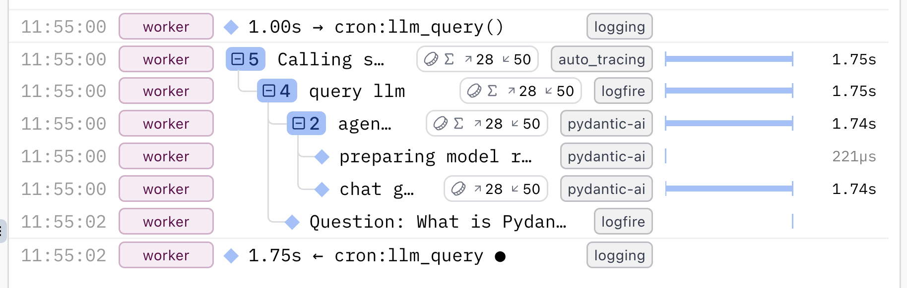 logfire.debug('{dob=} {age=!r}', dob=dob, age=date.today() - dob) # (3)!